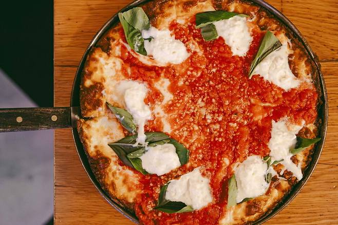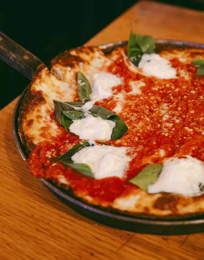 시카고 딥디쉬 피자는 루소 소시지, 페페로니, 부라타 & 바질 등이 있는데, 산뜻한 느낌을 원한다면 부라타 & 바질을, 미국의 진한 맛을 느끼려면 소시지와 페페로니 메뉴를 고르면 된다.