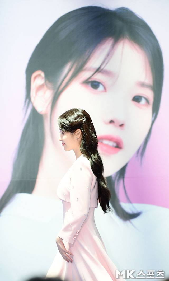 이날 아이유는 진주 장식이 은은하게 빛나는 핑크빛 롱 원피스를 입고 등장해 행사장을 환하게 밝혔다.