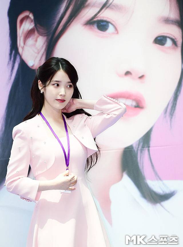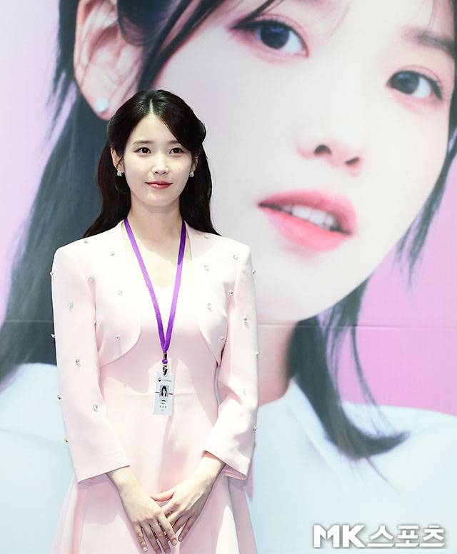 퍼플 컬러 스트랩의 명찰까지 더해지며 공적인 자리에서도 아이유만의 고유한 매력을 잃지 않은 패션 센스를 보여줬다.