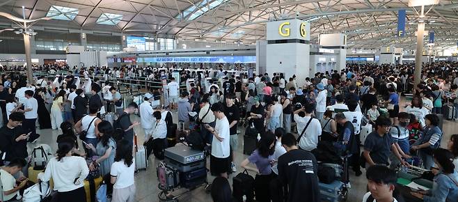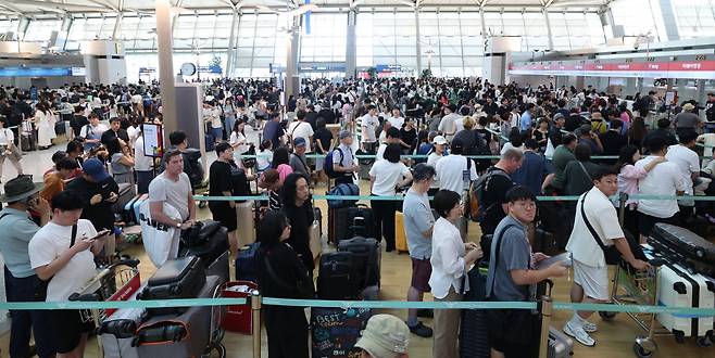 본격적인 여름휴가철에 접어든 25일 인천국제공항 1터미널 출국장이 해외로 떠나는 여행객들로 붐비고 있다.