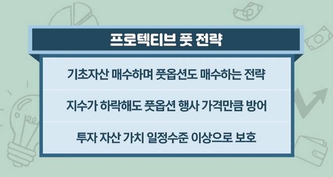 프로텍티브 풋 전략은 옵션 전략의 일종입니다. 주식을 매수하고 어느 행사가 아래로 내려갈 때 수익이 발생하는 보험장치처럼 풋옵션을 매수해서 결합한 전략을 말합니다.