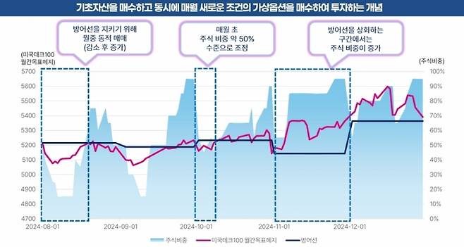 저희 상품은 단순하게 프로텍티브 풋 구조를 따릅니다. 하방을 어느 정도 제한하면서 상방을 최대한 여는 구조를 추구합니다. 비용을 줄이는 방법으로 옵션을 사용하지 않고 금융공학의 ‘델타헤지’ 방법으로 주식 채권의 비중 조절을 통해서 이 비용을 줄인다는 게 가장 큰 특징이 아닌가 싶습니다.