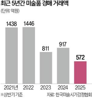 반면 경매와 아트페어 등 미술품 매매가 이뤄지는 거래시장은 3년째 침체가 지속되고 있다. 한국미술시가감정협회에 따르면 올 1~6월 경매시장 총거래액은 약 572억원으로, 전년 동기(917억원) 대비 37% 감소했다. 낙찰률은 49.77%에 그쳤다. 거래액과 낙찰률 모두 최근 5년 새 가장 낮았다. 활황으로 평가된 2022년(1446억원)과 비교하면 총거래액이 60.4% 줄었다. 인기 작가인 이우환 작품의 경매 낙찰 총액이 2022년 상반기 200억원에서 올해 39억원으로 급감한 게 이를 잘 보여준다.