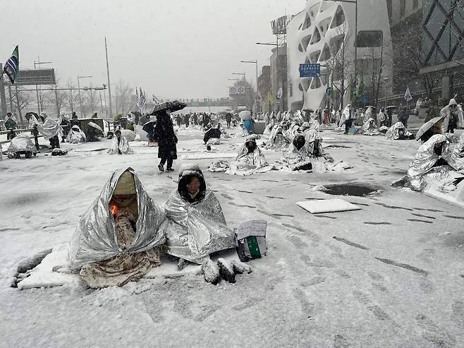 "24일 서울 여의도 국민의힘 당사 앞. 수많은 예술인과 시민들이 모여 "국민의힘 해체"를 외쳤다.