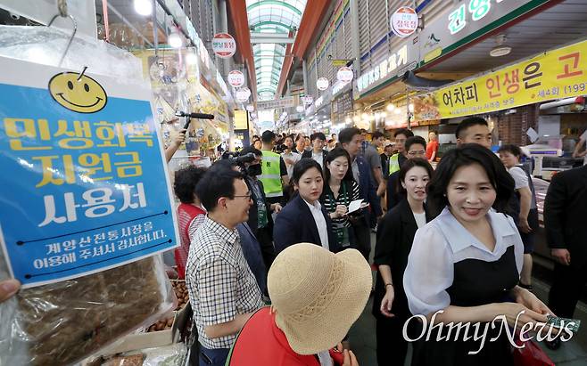 | ▲ 김혜경 여사가 25일 민생회복 소비쿠폰 이용을 위해 인천 계양산전통시장을 방문해 이동하고 있다. |