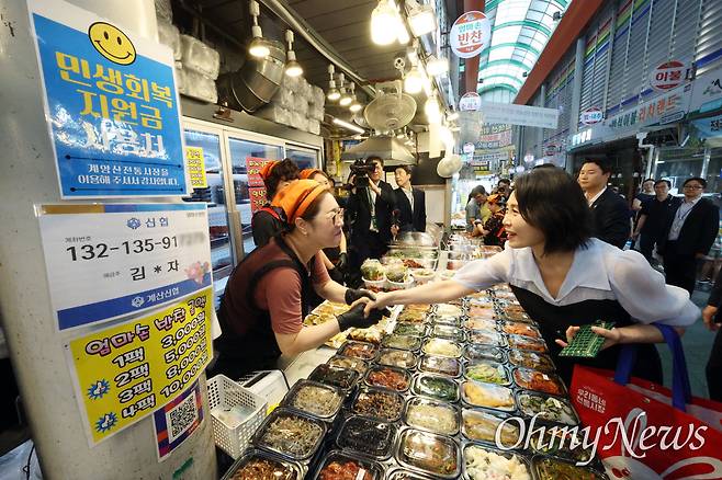 김 여사는 25일 오후 이 대통령이 당선되기 전까지 지역구였던 인천 계양구 계양산 전통시장을 일부러 방문해 상인들에게 "주소가 여기로 돼 있어서 소비쿠폰 쓰러 왔어요"라고 말했다.