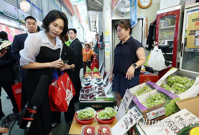 | ▲ 김혜경 여사가 25일 인천 계양산전통시장을 방문해 청과 매장에서 민생회복 소비쿠폰을 이용해 구매할 과일을 살펴보고 있다. |