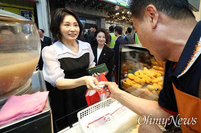 | ▲ 김혜경 여사가 25일 인천 계양산전통시장을 방문해 민생회복 소비쿠폰을 이용해 꽈배기를 구매하고 있다. |