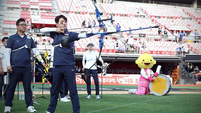 '세계 최강' 한국 양궁 대표팀이 프로야구 kt wiz의 도움을 받아 야구장에서 소음 적응훈련을 했습니다.