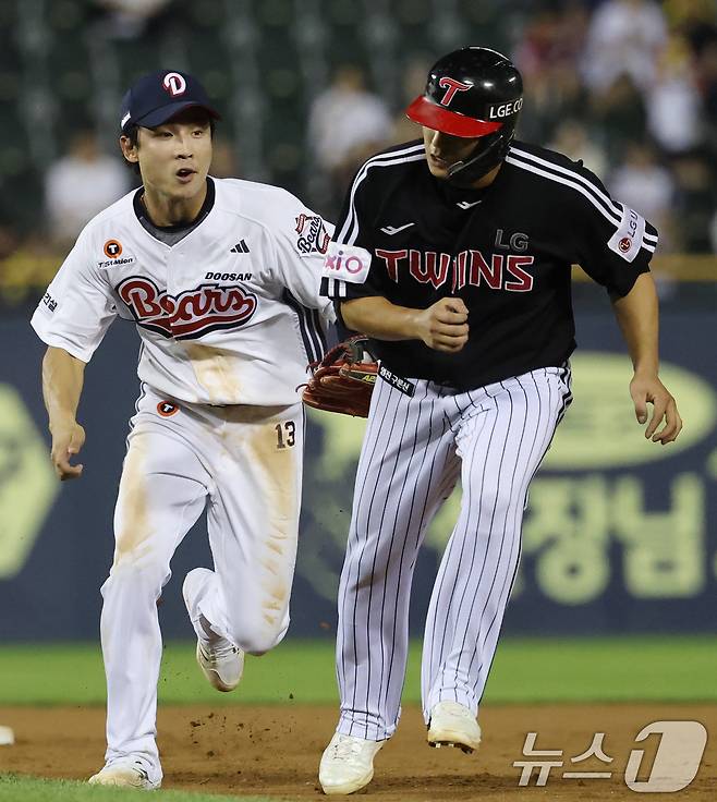 (서울=뉴스1) 오대일 기자 = 25일 서울 송파구 잠실야구장에서 열린 프로야구 '2025 신한 SOL뱅크 KBO 리그' LG 트윈스와 두산 베어스의 경기, 3:4로 뒤진 LG의 8회초 공격 1사 1루 상황에서 LG 1루주자 김주성이 협살에 걸려 아웃되고 있다. 두산 유격수는 이유찬. 2025.7.25/뉴스1