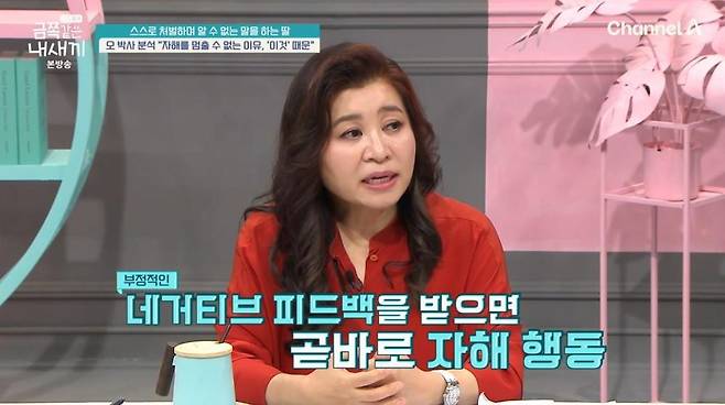 오 박사는 "네거티브 피드백을 받았을 때 기분이 나빠지는 것에서 끝나는 게 아니라 자해를 한다. 금쪽이는 거절이라는 단어에 민감하다. 거절이 아닌 상황에서도 본인이 그렇게 느끼는 거다. 본인의 말을 동의하지 않으면 거절로 받아들인다. 금쪽이가 거절을 왜 그토록 고통스러워 하는지 궁금해 해야 한다"라고 전했다.