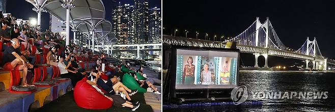(부산=연합뉴스) 강선배 기자 = 25일 오후 부산 수영구 민락수변공원에서 시민들이 등받이형 좌석과 무선 헤드셋을 이용, 바다에 설치한 스크린을 통해 영화를 관람하고 있다.