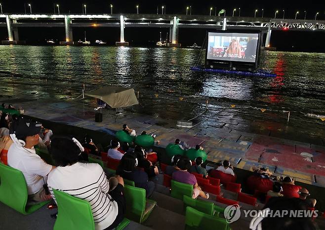 (부산=연합뉴스) 강선배 기자 = 25일 오후 부산 수영구 민락수변공원에서 시민들이 등받이형 좌석과 무선 헤드셋을 이용, 바다에 설치한 스크린을 통해 영화를 관람하고 있다.