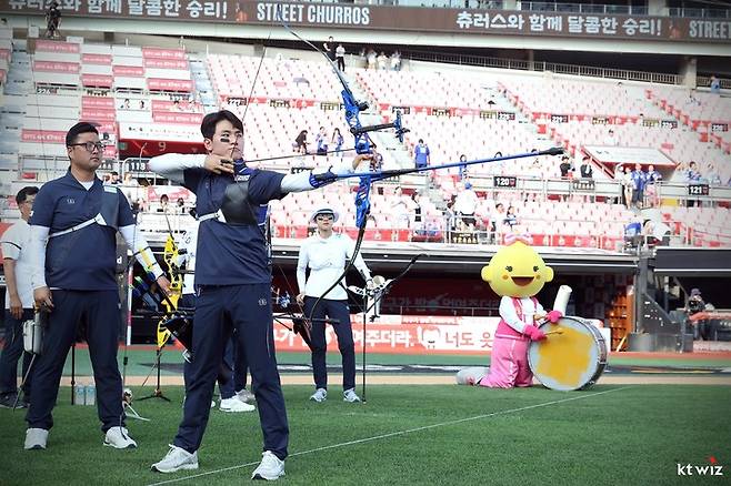한국 양궁 대표팀이 프로야구 kt wiz의 홈구장인 수원 케이티위즈파크에서 특별 환경 적응 훈련을 진행했다.