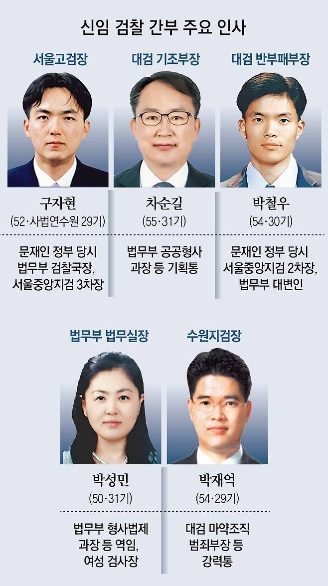 이번 인사에서는 문재인 정부 시절 핵심 보직을 맡았던 인물들의 ‘복귀’가 두드러진다는 분석이 나온다. 전국 고검장 중 최선임인 서울고검장에 임명된 구 연구위원이 대표적이다. 구 신임 고검장은 문재인 정부 때 법무부 검찰국장, 서울중앙지검 3차장 등 핵심 보직을 맡았다. 하지만 윤석열 정부 들어선 대전 및 광주고검 차장검사와 비(非)수사 부서인 법무연수원 등을 맴돌았다. 전국 특수수사를 총괄하는 대검 반부패부장에는 박철우 부산고검 검사(30기)가 승진 임명됐다. 박 검사는 문재인 정부 당시 서울중앙지검 2차장과 법무부 대변인을 지냈으며, 이후 대구·부산고검 등으로 자리를 옮겼다.