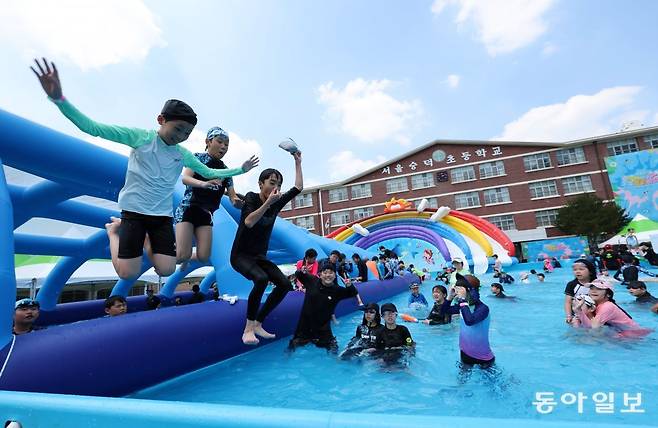“오늘은 우리 학교가 워터파크” 각급 학교가 여름방학을 맞이한 25일 서울 성북구 숭덕초교에 설치된 물놀이장에서 어린이들이 물놀이를 하면서 더위를 식히고 있다. 26일도 서울 낮 최고기온이 38도까지 오르며 폭염이 이어질 것으로 전망된다. 홍진환 기자 jean@donga.com