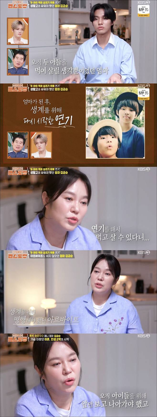 브라질에서 한국으로 온지 15년. 김금순은 두 아이를 키우기 위해 생계형 배우가 됐다. 김금순은 "중학교 때부터 29살 때까지 연극만 계속 했다. 저는 매체(영화, 드라마)를 할 거라고는 0.000001%도 생각 없던 사람이었다. 주변에서 매체 연기를 해보라. 생활이 연극할 때보다는 낫다 해서 집에서 사진을 찍어서 프로필을 돌렸는데 단편영화에서 연락이 왔다. '내가 연기를 해서 먹고 살 수가 있네? 대박. 애들 반찬값 벌 수가 있네'해서 열심히 했다"고 밝혔다.