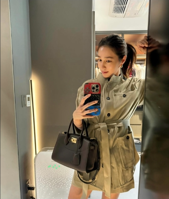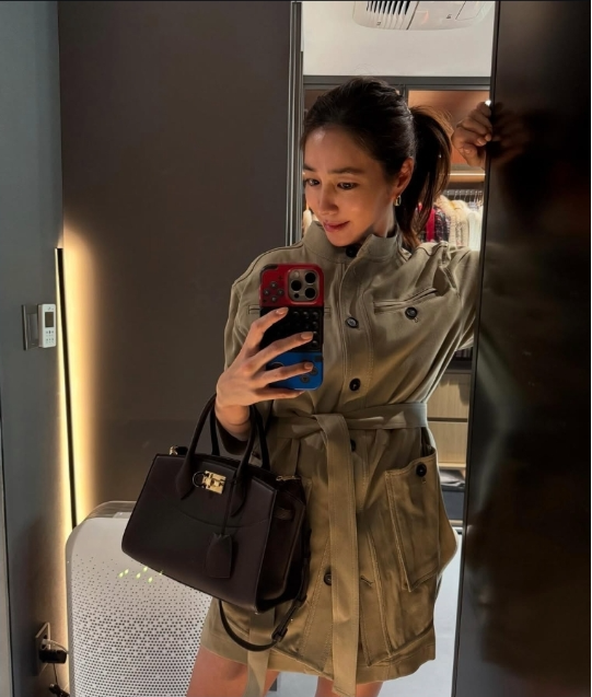 공개된 사진 속 이민정은 단정한 카키색 벨티드 재킷 원피스를 입고 거울 앞에서 포즈를 취하고 있다.