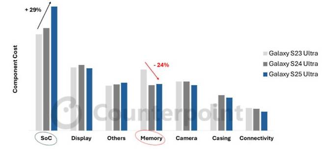 26일 카운터포인트리서치에 따르면 올해 초 출시된 갤럭시S25 울트라는 전작인 S24 울트라 대비 제조 원가(BoM·Bill of Materials) 기준 3.4%의 상승이 발생한 것으로 추정된다.