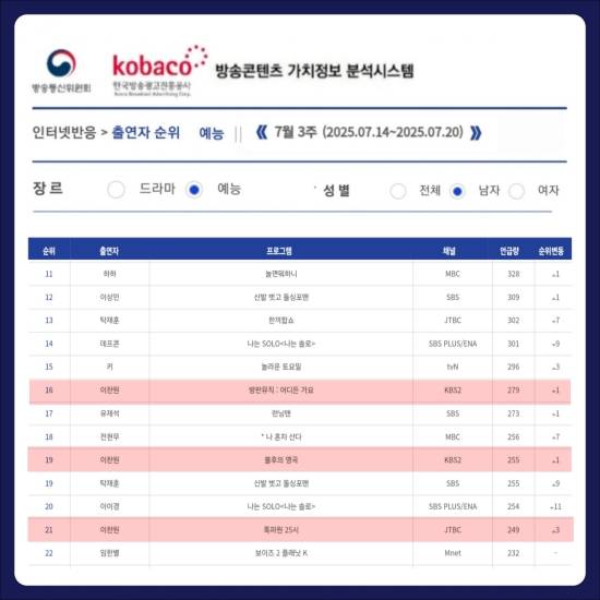최근 방송콘텐츠 가치정보 분석 시스템(RACOI)에 따르면, 2025년 7월 3주 차(7월 14일~7월 20일) 인터넷 반응 분석 출연자 순위 남자 예능 부문에서 이찬원이 세 작품으로 랭킹에 이름을 올렸다.