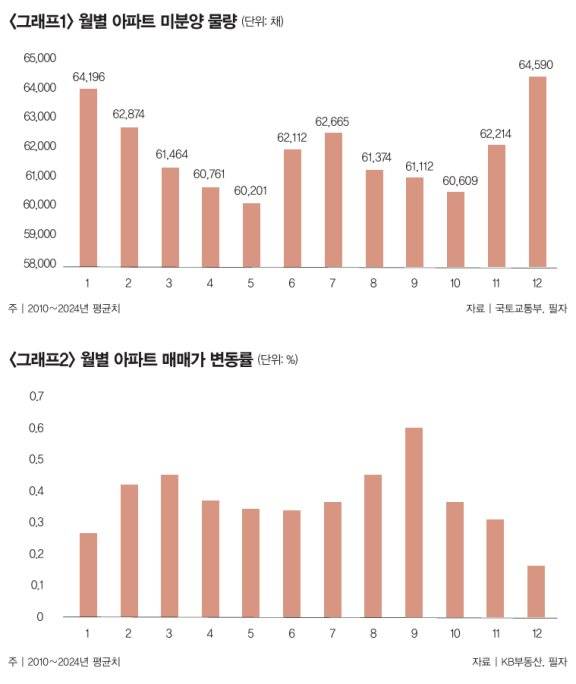 재고 주택시장의 계절 투자 패턴은 어떨까. 2010∼2024년 매매가 상승률은 9월에 정점을 찍고 꾸준히 낮아져 12월과 해를 지난 1월 저점을 기록하는 패턴을 보인다(그래프2 참조). 투자의 기본 원칙은 저점에 사서 고점에 파는 것이다. 주택시장 비수기인 겨울에 매입 타이밍을 잡고 가을이 지나기 전 매도 시기를 잡는 게 현명한 선택이다. 집값에 지대한 영향을 미치는 입주 물량은 지난 15년간 가을을 기점으로 12월까지 급증하는 양상을 보였다. "입주 물량이 쏟아져 집값이 하락한다"는 보도가 대개 이 시즌에 집중된다. 냉철한 투자자라면 쏟아지는 입주 물량 속에서 저평가된 부동산을 낚아챌 것이다.