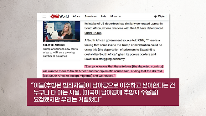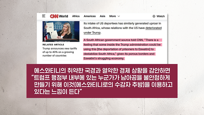 그리고 남아프리카공화국 사례도 있습니다. 남아공의 외교 소식통은요, 미국 언론에 이렇게 말했습니다. 이들, 그러니까 추방된 범죄자들이 남아공에 오고 싶어 한다는 건 누구나 아는 사실이다, 미국이 남아공에 수용을 요청했지만 우리는 거절했다라고 말했습니다. 그러면서 그는 미국이 이들을 남아공 국경 인근의 에스와티니에 보낸 것은 국가 안보를 겨냥한 도발이다라고까지 표현을 했는데요. 또 다른 남아공 정부 관계자도 이렇게 말했습니다. 에스와티니의 취약한 국경과 열악한 경제 상황을 감안하면 트럼프 행정부 내부에 있는 누군가가 남아공을 불안정하게 만들기 위해서 이 추방을 의도적으로 활용하고 있다는 느낌을 받는다라고까지 이야기를 했습니다.