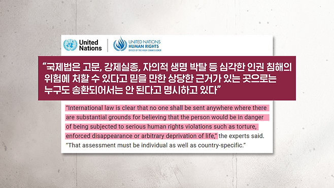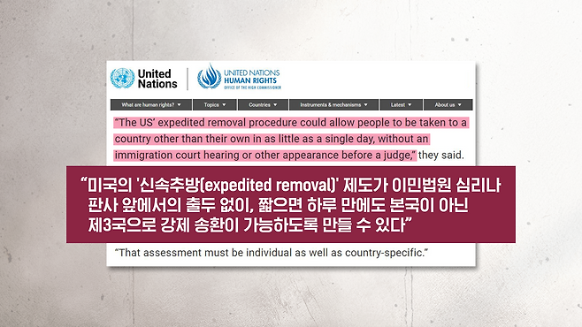 유엔 인권 전문가들은요. 올해 7월 공식 발표를 통해서 미국의 신속 추방 제도는 "이민법원 심리나 또 판사 앞에서 출두 없이 짧으면 하루만 해도 본국이 아닌 제3국으로 강제 송환이 가능하도록 만들 수 있다"라고 비판했습니다. 그러면서 "국제법은 고문, 강제실종 등의 심각한 인권 침해의 위험에 처할 수 있다고 믿을 만한 상당한 근거가 있는 곳으로는 누구도 송환이 되어서는 안 된다라고 명시하고 있다"라고 강조를 했습니다.