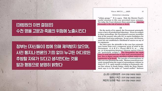 미국 연방 대법원이 트럼프 행정부가 추진해온 제3국 신속추방 정책의 재개를 허용하자, 진보 성향의 대법관 3명이 "이번 결정은 수천 명을 고문과 죽음의 위험에 노출시킨다", "정부는 (자신들이) 법에 의해 제약받지 않으며, 사전 통지나 변론의 기회 없이 누구든 어디로든 추방할 자유가 있다고 생각한다는 것을 말과 행동으로 분명히 밝혔다"고 지적하기도 했습니다.
