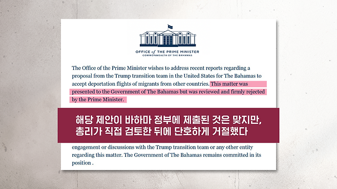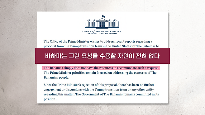 바하마 총리실은 지난해 12월에 트럼프 당선인 인수위로부터 이민자 수용 제안을 받은 사실을 인정을 했습니다. 그러면서 총리가 직접 검토한 뒤에 단호하게 거절했다라고 말했습니다. 자신들에게는 그런 요청을 수용할 자원이 전혀 없다, 총리의 최우선 순위는 바하마 국민들의 안전과 우려를 해결하는 것이다라고 했고요.