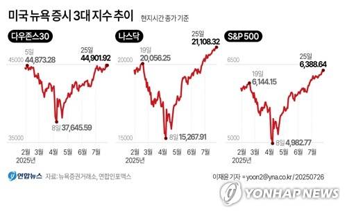 (서울=연합뉴스) 김토일 기자 = 미국 기업들의 견조한 실적과 미국과 유럽연합(EU) 간 무역 협상 타결 기대감에 25일(현지시간) 뉴욕증시가 상승 마감했다.