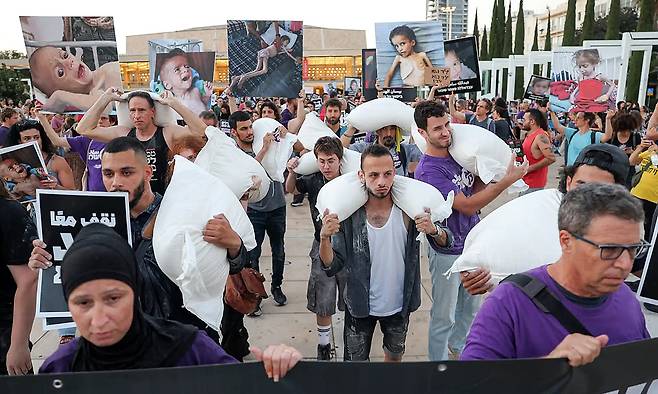 22일(현지시간) 이스라엘의 텔아비브에서 이스라엘인 시민활동가들이 밀가루 자루를 어깨에 짊어지고 이스라엘 국방부 본부를 향해 행진하고 있다. 지난 5월 이스라엘이 가자지구 내 국제 구호단체들의 구호활동을 금지하고 봉쇄를 강화하며 기아 사망자가 급증하는 등 인도적 위기를 겪자 이스라엘 활동가들조차 자국의 ‘식량 무기화’를 비판하며 들고 일어선 것이다. 2023년 10월 팔레스타인 이슬람 무장정파 하마스의 이스라엘 기습 공격으로 전쟁이 시작된 뒤 이스라엘과 팔레스타인 국민도 서로의 입장차 속 반목해왔다. 그러나, 현실로 다가온 최악의 인도주의적 위기 속 두 국가의 뜻있는 사람들이 생각을 합쳐가고 있다. 일단은 살아야 한다고.