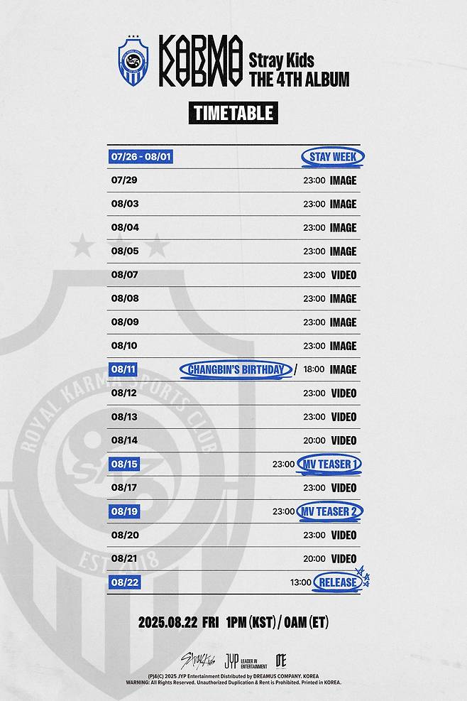 JYP엔터테인먼트는 지난 25일 스트레이 키즈 SNS에 정규 4집 '카르마'(KARMA) 트레일러 영상과 타임테이블 이미지를 올렸다.