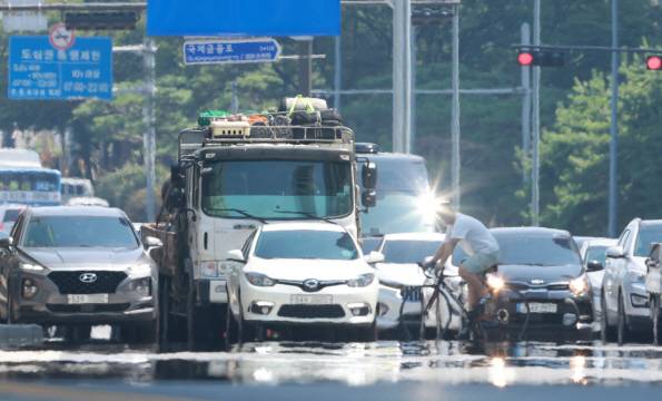 [전국 대부분 지역에 폭염 특보가 발효된 25일 서울 영등포구 여의도 여의대로에 아지랑이가 피어오르고 있다. (사진=연합뉴스)]