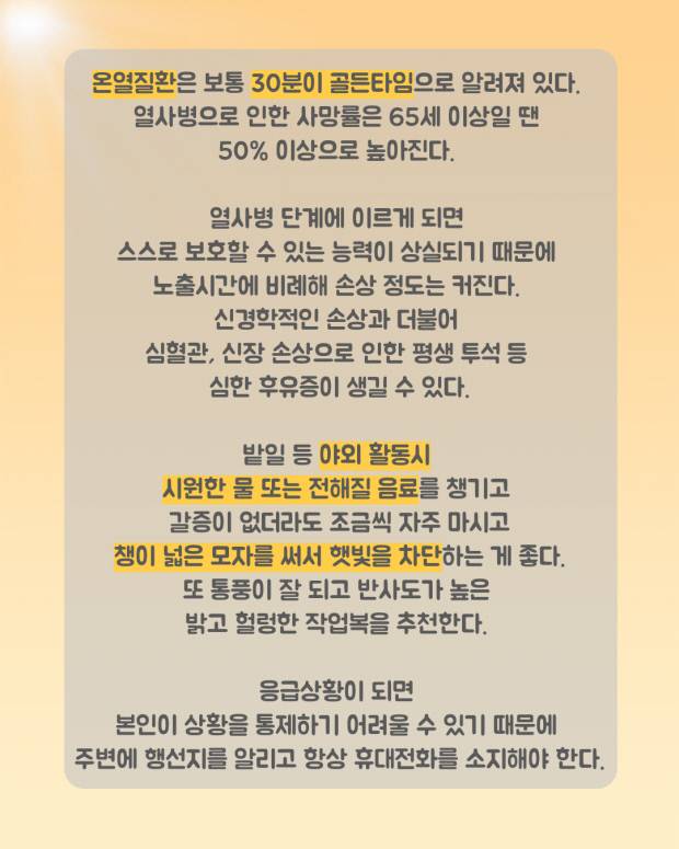 온열질환은 보통 30분이 골든타임이며, 의식장애·구통 등의 증세가 발생하면 그늘진 곳으로 옮기고 바로 119로 신고해야 한다. 응급상황이 되면 본인이 상황을 통제하기 어려울 수 있기 때문에 주변에 행선지를 알리고 항상 휴대전화를 소지해야 한다.