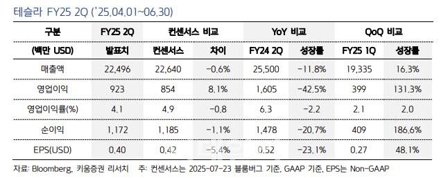 김승혁 연구원은 “BYD의 가파른 성장세 역시 부담으로 작용했다”며 “이에 더해 전 분기 대비 관세 비용이 3억 달러(자동차 부문 3분의 2) 늘어나 원가 압력이 더해지자 마진 회복 기대감 또한 후퇴했다. 결국 이익 감소와 비용 증가가 동시에 나타나면서 시장은 단기적으로 테슬라의 이익전망치를 하향 조정했고, 주가는 큰 폭으로 하락했다”고 분석했다.