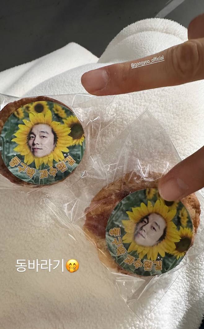 해당 사진은 쿠키 포장지 위에 공유의 얼굴을 해바라기 꽃잎에 합성한 것으로, 포장지에는 '동구박 과수원길'이라는 문구도 적혀 있어 웃음을 자아냈다.