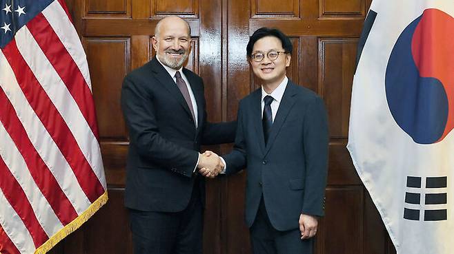 ▲ 김정관 산업통상자원부 장관이 24일(현지시간) 미국 워싱턴 DC 상무부 회의실에서 하워드 러트닉 상무부 장관과 면담, 기념 촬영하고 있다.