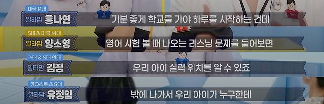 학벌주의 조장, 과잉 사교육 유발... 맞다. 그런데 내가 가장 경악한 부분은 전문가 패널 역할을 맡은 '일타맘 군단'이 자녀의 대학 타이틀로 불리는 것이었다. 'S대' ,'Y대' 등이 적힌 배지를 착용하는 것으로도 모자라, 이들이 발언할 때마다 'Y대맘', 'Y대&S대 의대맘', '미국P대맘', 'S대&미국M대맘' 등의 자막이 반복해서 뜬다. 자녀의 성적표는 부모의 성적표가 아니라는 건 나만의 착각이었나.