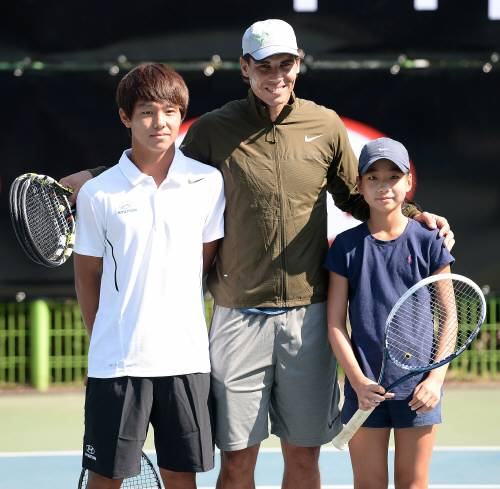 <사진> 나달은 2013년 한국을 찾아 청각장애 테니스 유망주 이덕희에게 한 수 지도를 했다.