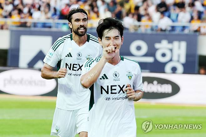 (광주=연합뉴스) 정다움 기자 = 26일 광주월드컵경기장에서 열린 하나은행 K리그1 2025 24라운드 광주FC와 전북현대의 경기. 전북 김진규가 전반전에 선제골을 넣은 뒤 기뻐하고 있다. 2025.7.26
