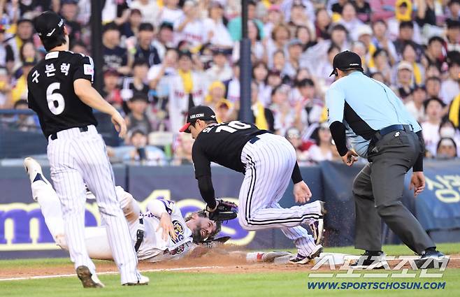 26일 잠실구장에서 열린 두산과 LG의 경기. 5회 1사 1, 3루 김재환 내야땅볼 타구 때 런다운 걸려 3루에서 태그아웃을 당하고 있는 두산 케이브. 잠실=송정헌 기자songs@sportschosun.com/2025.07.26/