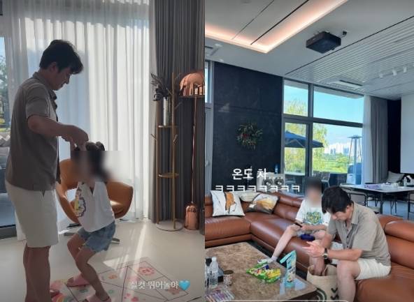 정준호는 거실로 보이는 곳에서 딸과 함께 일명 '땅따먹기' 놀이를 하고 있으며 이하정은 "실컷 뛰어놀아"라며 사랑스러운 부녀의 일상에 흐뭇한 모습을 보였다.