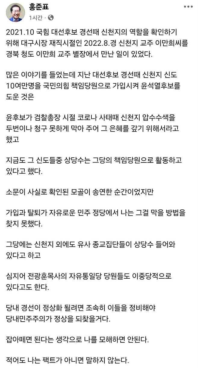 홍 전 시장은 "대구시장 재직시절인 2022년 8월경 신천지 교주 이만희씨를 경북 청도 이만희 교주 별장에서 만난 일이 있었다"며 운을 뗐다. 이어 "많은 이야기를 들었는데, 지난 대선후보 경선 때 신천지 신도 10여만명을 국민의힘 책임당원으로 가입시켜 윤석열 후보를 도운 것은 윤 후보가 검찰총장 시절 신천지 압수수색을 두 번이나 청구 못하게 막아 주어 그 은혜를 갚기 위해서"라고 했다고 적었다.
