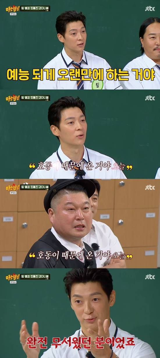 이날 방송에서 팀은 "솔직히 예능 되게 오랜만이다. 오늘 호동이 때문에 왔다. 옛날에 내 첫 예능 출연 '천생연분'을 모니터하러 갔었다. 그때는 (강호동이) 완전 무서웠던 분이었다. 솔직히 기다리면서 목소리 듣고 트라우마가 다시 올라왔다"라고 밝혔다.