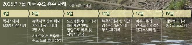 2025년 7월, 미 전역이 ‘물폭탄’에 뒤덮였다. 7월4일부터 시작된 미국 독립기념일 연휴 기간 발생한 대홍수로 남부 텍사스주에서 최소 135명이 사망한 것을 시작으로 약 2주 동안 뉴멕시코(남서부), 일리노이(중부), 노스캐롤라이나(남동부), 메릴랜드(동부), 뉴욕(북동부) 등 거의 미 전역에서 동시다발적으로 급류성 홍수가 발생한 것이다. 불과 몇 시간만에 급작스럽게 내리는 비로 일리노이 시카고와 같은 대도시와 수도 워싱턴 인근 메릴랜드 몽고메리 카운티 등에서 도로가 물에 잠기고 사람들이 자동차를 물에 잠긴 도로 한가운데 버리고 나오는 모습도 심심찮게 눈에 띄었다.
