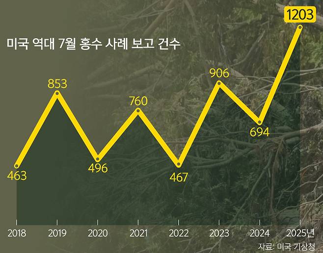‘7월 물폭탄’의 시작은 남부 텍사스였다. 미 독립기념일이었던 7월 4일 새벽 텍사스 중부 힐 컨트리 지역에서 밤새 10인치(약 25㎝) 이상의 폭우가 쏟아졌다. 계곡과 하천이 범람하며 30피트(약 9m) 높이의 급류가 마을을 휩쓸었고 강가 캠프장에 머물던 130명 이상이 목숨을 잃었다. 특히 토양이 얇고 석회암 지층이 많은 지형이 물을 흡수하지 못해 피해를 가중시킨 것으로 파악된다. 텍사스 중에서도 트래비스 카운티엔 이후에도 여러 차례 폭우가 이어지며 7월 한 달 강수량이 평년의 5배에 달했다. 텍사스 당국은 2억 달러(약 2760억원) 이상의 피해액을 추산하며 복구비 등을 감당하기 위해 재산세 인상도 논의하고 있다.