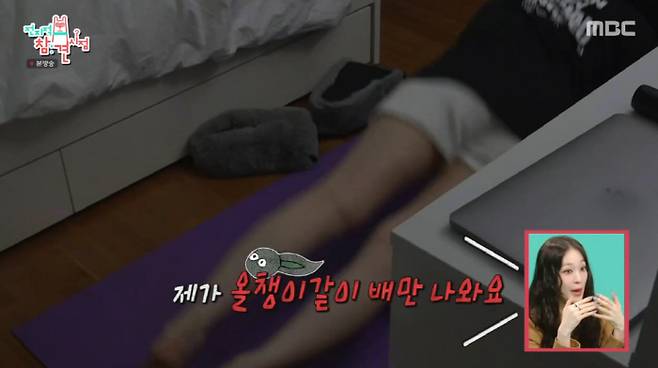 애니는 한점 흐트러짐 없는 자세로 복근 운동을 진행, "먹는 걸 진짜 좋아한다. 올챙이 같이 배만 나온다"며 웃었다.
