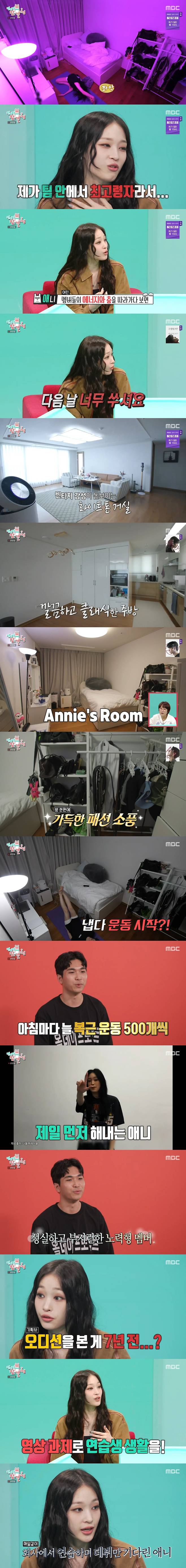 매니저는 "애니는 전날 스케줄이 늦게 끝나도 복근 운동 500개씩 자기 관리를 철저하게 한다"면서 "처음에는 배경도 모르고 아무 것도 모르고 만났다. 회사에서 과제를 내줄 때마다 애니가 가장 먼저 해내고, 성실하고 부지런한 노력형 멤버"라고 칭찬했다.
