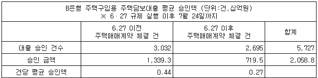 B은행에서도 6월 27일 이후 계약 건의 평균 승인액(2억7천만원)이 이전(4억4천만원)보다 40%나 줄었다.