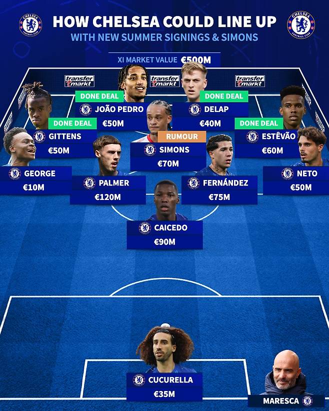 이적시장 전문 사이트 ‘트랜스퍼마르크트’는 26일(한국 시각) 소셜네트워크서비스(SNS)를 통해 2025-26시즌 첼시 예상 라인업으로 전했다. 그런데 이 사이트는 첼시가 공격진 보강에 열중하자, 다음 시즌 1-4-3-2 전형을 쓸 거라고 재치 있게 표현했다.